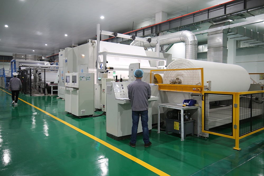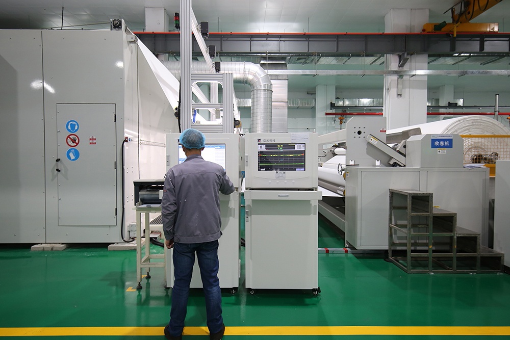 為更好地促進企業的發展,公司于2020年12月進行新的投入,引進法國國際先進水刺無紡布生產線和生產技術,配備先進的污點檢測儀和克重檢測儀等在線檢測儀器,現有國際標準自動化水刺無紡布生產流水線2條和干巾生產線2條,專業生產開發克重30克到100克㎡,門幅小于3300㎜的各種水刺產品及各種底部抽和小包抽棉柔巾,年生產能力10000多噸。本產品可廣泛應用于干巾清潔類,濕巾衛材類,美容護理類,醫用材料等。